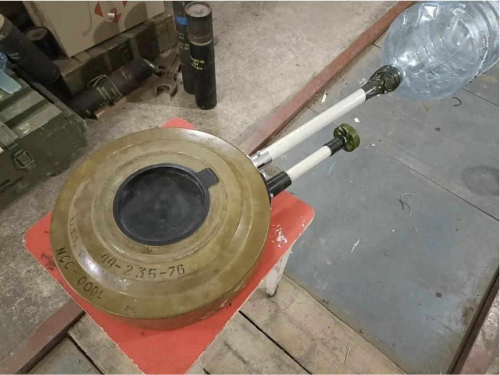 PTM-K2N – dual use – AV-mine and FPV-drone warhead. Incorporates microcontroller with magnetic sensor to initiate EFP warhead at suitable distance from the target. When used as an AV-mine, it also uses an accelerometer, so it will function when moved. Photograph curtesy of the Russian 155th Naval Infantry Brigade