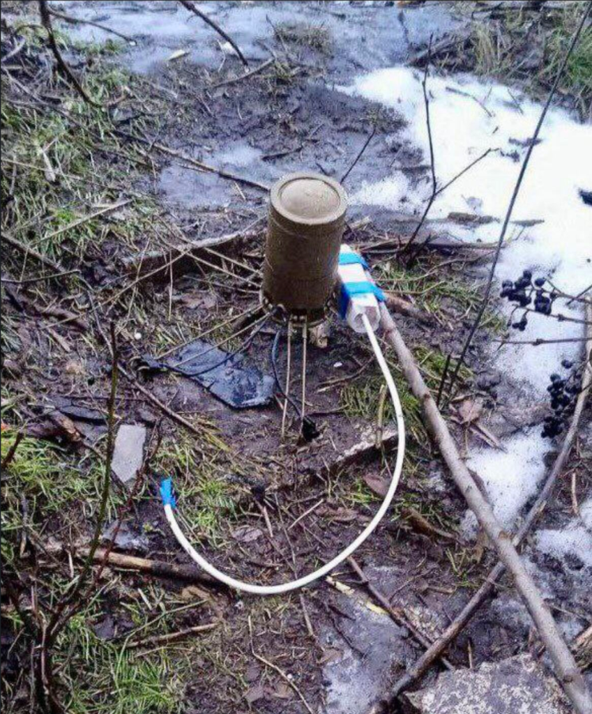 The above photograph shows a TM-62M anti-vehicle mine fitted with an improvised tail-stabilising unit made out of a length of plastic piping and a large water bottle. The improvised impact fuze is contained in the shorter length of piping. M42 submunitions have been used in the role as improvised impact fuzes for these munitions.