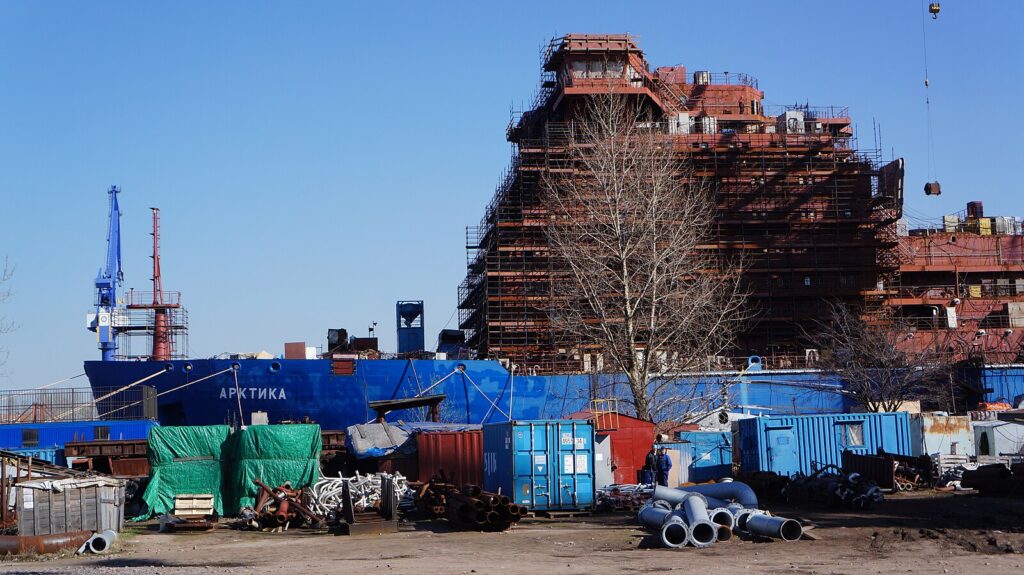 Russia’s nuclear-powered icebreakers turn climate windows into predictable convoy movement. The Project 22220 (LK-60Ya) class — Arktika, Sibir, Ural in service; Yakutia fitting out; Chukotka launched; more hulls authorized — provides high-power channel-making through multiyear ice, with dual-draft hulls for deep approaches and shallower estuaries. Plans for the larger Project 10510 (“Rossiya/Lider”) aim to widen channels for heavy tonnage further into winter.